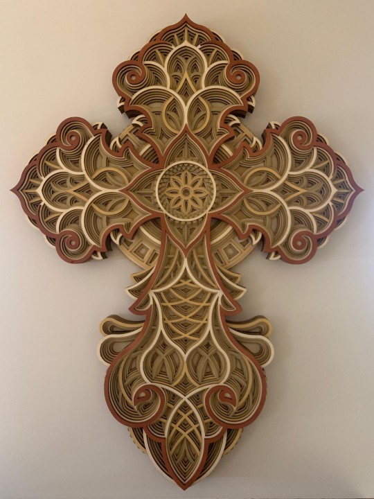 Mandala tak trochu inak. Mandalový kríž v ľubovolnej farebnej kombinácii, pri vybere farieb jednotlivych vrstiev možnosť zaslania náhľadu ako bude vyzerať Vami vybrané farebné prevedenie. 8 vrstiev topoľovej preglejky ručne farbenej a lepenej. Výška 70cm, šírka 52cm, hrúbka 3.4cm