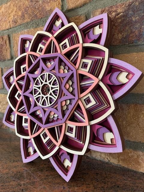 Mandala má silný vplyv na človeka na nevedomej úrovni. Nielen pri jej tvorbe, ale i pri pozorovaní mandaly dochádza k upokojeniu duše a získaniu vnútornej rovnováhy, preto sa skvelo hodí do interiéru či exteriéru.Mandala v ľubovolnej farebnej kombinácii, pri výbere farieb jednotlivych vrstiev možnosť zaslania náhľadu ako bude vyzerať Vami vybrané farebné prevedenie. 10 vrstiev topoľovej preglejky ručne farbenej a lepenej. Výška 40cm, šírka 40cm, hrúbka 3cm