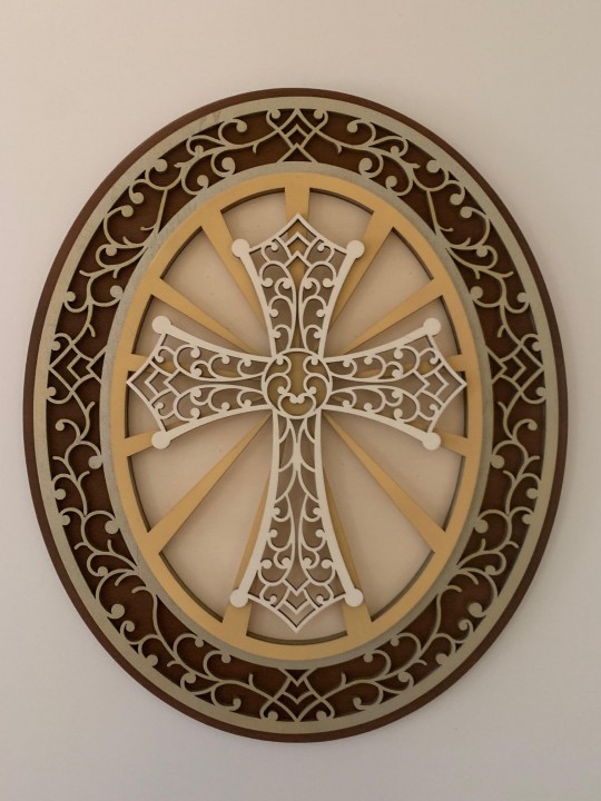 Kríž v ľubovolnej farebnej kombinácii, pri výbere farieb jednotlivych vrstiev možnosť zaslania náhľadu ako bude vyzerať Vami vybrané farebné prevedenie. 4 vrstvy topoľovej preglejky ručne farbenej a lepenej. Výška 70cm, šírka 52cm, hrúbka 3.4cm