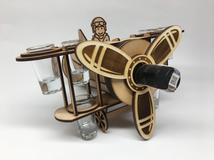 Originálny a Štýlový darček - držiak na fľašku a 6 štamprlíkov v tvare lietadla. Držiak je možné personalizovať ľubovoľným textom / číslom / venovaním. Fľaška alkoholu nie je v cene. Material: 4mm buková preglejka. Veľkosť: Cca 30x30cm