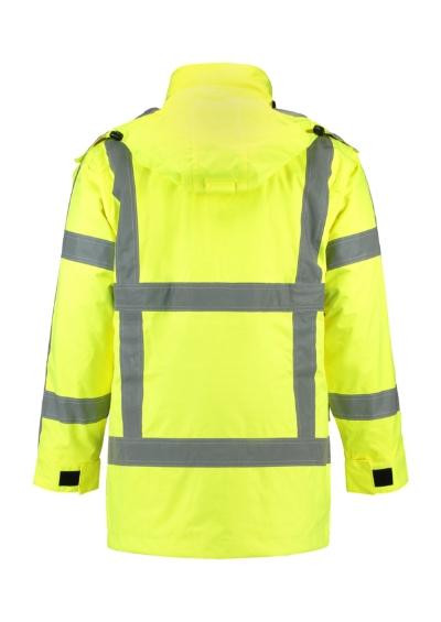 odev s vysokou viditeľnosťou, vodeodolný, vetruodolný a priedušný materiál, retroreflexné pruhy, odnimateľná kapucňa, vetracie otvory v podpazuší, vnútorné náprsné vrecká, obojsmerný zips s otvoreným koncom, vodeodolné zipsy, podlepené švy, odnímateľná hrejivá podšívka, certifikácia podľa noriem EN ISO 20471/A1 (trieda 3), EN 343 (trieda 3:1), Tricorp číslo produktu: