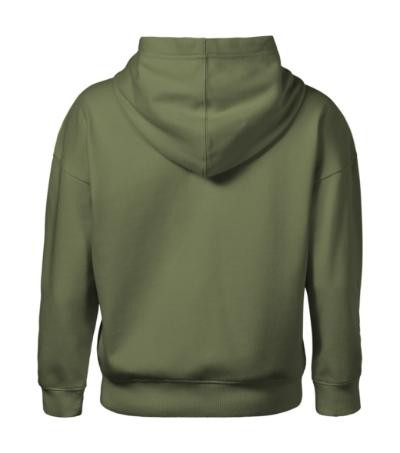 bez etikety - pripravené na rebranding, voľný strih s bočnými švami, kapucňa s podšívkou, na stiahnutie šnúrkou, neutrálny veľkostný štítok v bočnej časti priekrčníka, vnútorná časť priekrčníka začistená páskou vo farbe povrchového materiálu, nízkohlavicové rukávy, lištové vrecká v štýle klokanky, dolný lem a manžety rukávov z rebrového úpletu 2:2 s 5 % elastanu, vnútorná strana počesaná