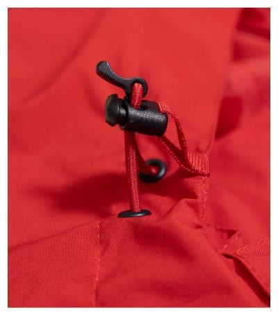 ľahký vodeodolný materiál s membránou, úprava BIONIC FINISH® ECO zabraňujúca prieniku vody, strih tvarovaný bočnými dielmi, vodeodolný zips zakončený krytkou brady, snímateľná kapucňa na sťahovateľnú šnúrku, lemy rukávov nastaviteľné suchým zipsom, bočné vrecká s reverzným špirálovým zipsom, vnútorné náprsné vrecko na suchý zips, podlepené švy, vstup pre branding v bočnom šve podšívky, tvarovaný a mierne predĺžený zadný diel, dolný okraj stiahnutý pruženkou v bočnej časti, odvetrávateľné v zadnej časti , reflexné prvky