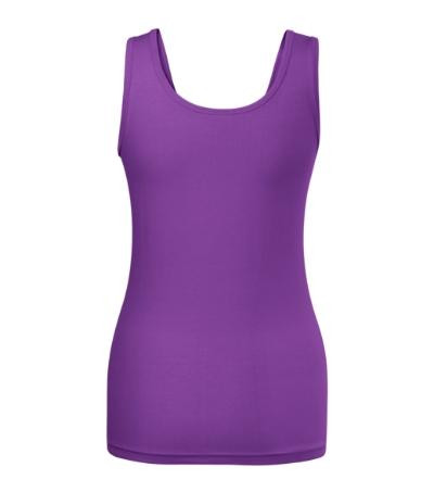 strečový materiál udržujúci stálosť tvaru, priliehavý strih s bočnými švami, hrubší guľatý výstrih, priekrčník a prieramky lemované povrchovým materiálom, širšie ramienka