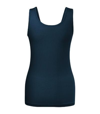 strečový materiál udržujúci stálosť tvaru, priliehavý strih s bočnými švami, hrubší guľatý výstrih, priekrčník a prieramky lemované povrchovým materiálom, širšie ramienka