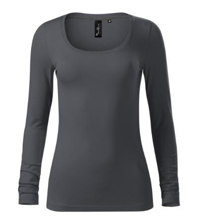 strečový materiál udržujúci stálosť tvaru, priliehavý strih s bočnými švami, hrubší guľatý výstrih, úzky lem priekrčníka z rebrového úpletu 1:1 s 5 % elastanu, vnútorná časť priekrčníka začistená kontrastnou páskou, spevnenie ramenných švov páskou, dlhé rukávy