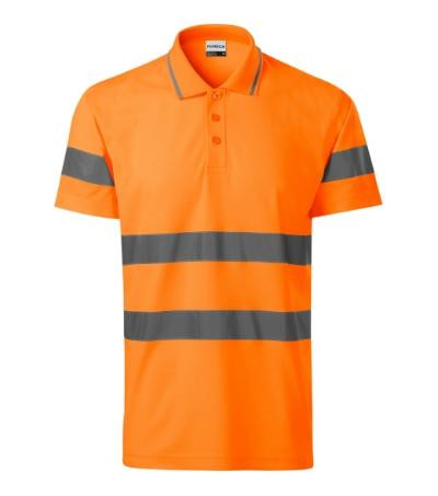odev s vysokou viditeľnosťou, vonkajšia strana fluorescenčný polyester, vnútorná strana bavlnená, certifikované retroreflexné pruhy 3M, strih s bočnými švami, golierik s kontrastným pásikom z rebrového úpletu 1:1, léga s 3 gombíčkami vo farbe materiálu, vnútorný priekrčník začistený páskou z povrchového materiálu, spevnenie ramenných švov páskou, certifikácia podľa noriem EN ISO 20471/A1 (trieda 2) a EN ISO 13688